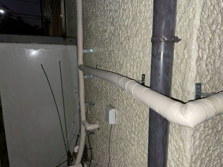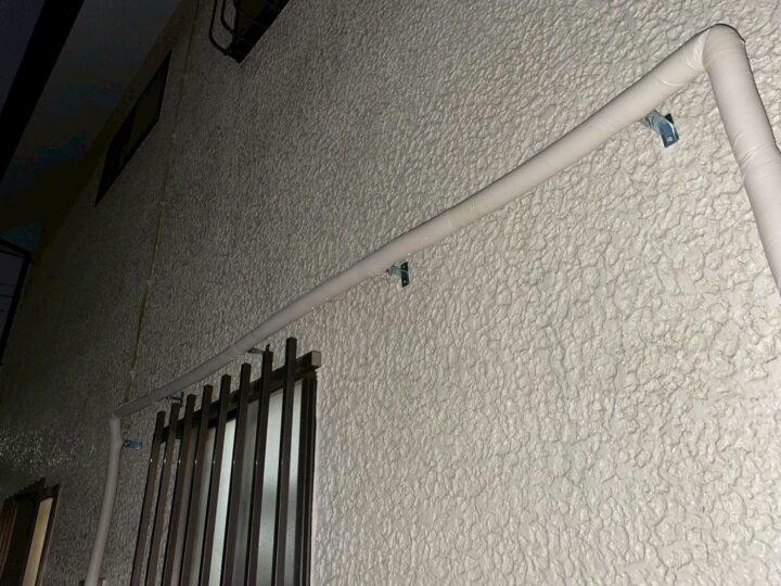 配管の敷設が完了した後、外壁に露出した全配管を保温材で被覆しました。給湯管を断熱することで熱損失を抑えてエネルギー効率が上がるほか、給水管は冬季の凍結リスクを低減できます。特に雨が当たりやすい軒先・庇まわりは保温材を二重に巻き付け、耐候性と断熱性を強化しています。